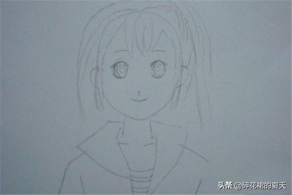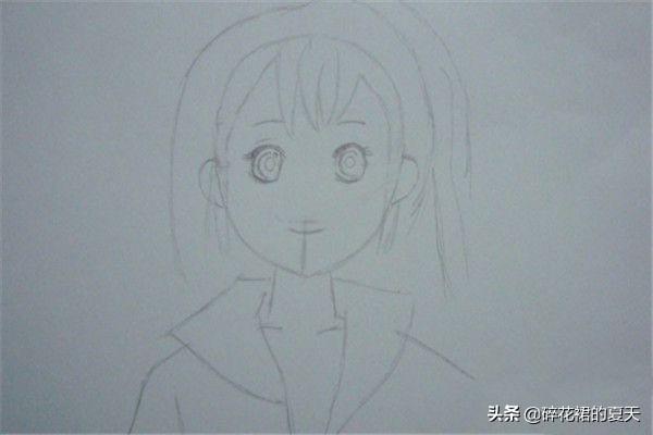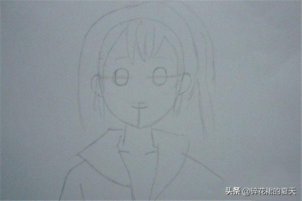 6 绘制出萌少女发型的外轮廓,添加衣领和外衣的形状。 接着,用铅笔绘制出萌少女头发的厚度,绘制出发型的外轮廓,添加衣领和外衣的形状,如下图所示。