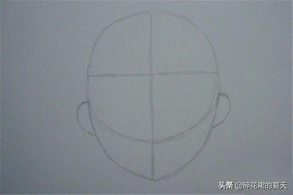 3 正圆的切点处画出对称的耳朵。 然后,用铅笔在正圆的切点处画出对称的朵,注意耳朵的高度不要超出发际线,这样头型的轮廓就定好了,如下图所示。