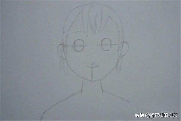 8 细致刻画鼻子和嘴巴,并画出衣服的纹饰出来。 接着,除去多余的辅助线,细致刻画鼻子和嘴巴,并画出衣服上的横格纹饰出来,如下图所示。