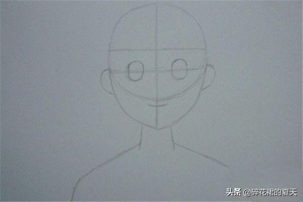 4 在相应的位置画出五官的大致轮廓。 接着,用横线定位出萌少女眼睛的位置,并添加出萌少女的颈部和肩部,接着在相应的位置画出五官的大致轮廓,如下图所示。