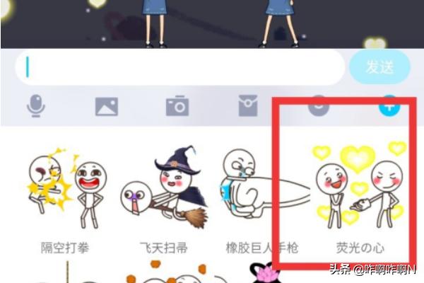 其次,也可以通过QQ厘米秀:点击发送键下面的+号,右划至第三栏,点击厘米秀,找到相应的动作发送就可以了。